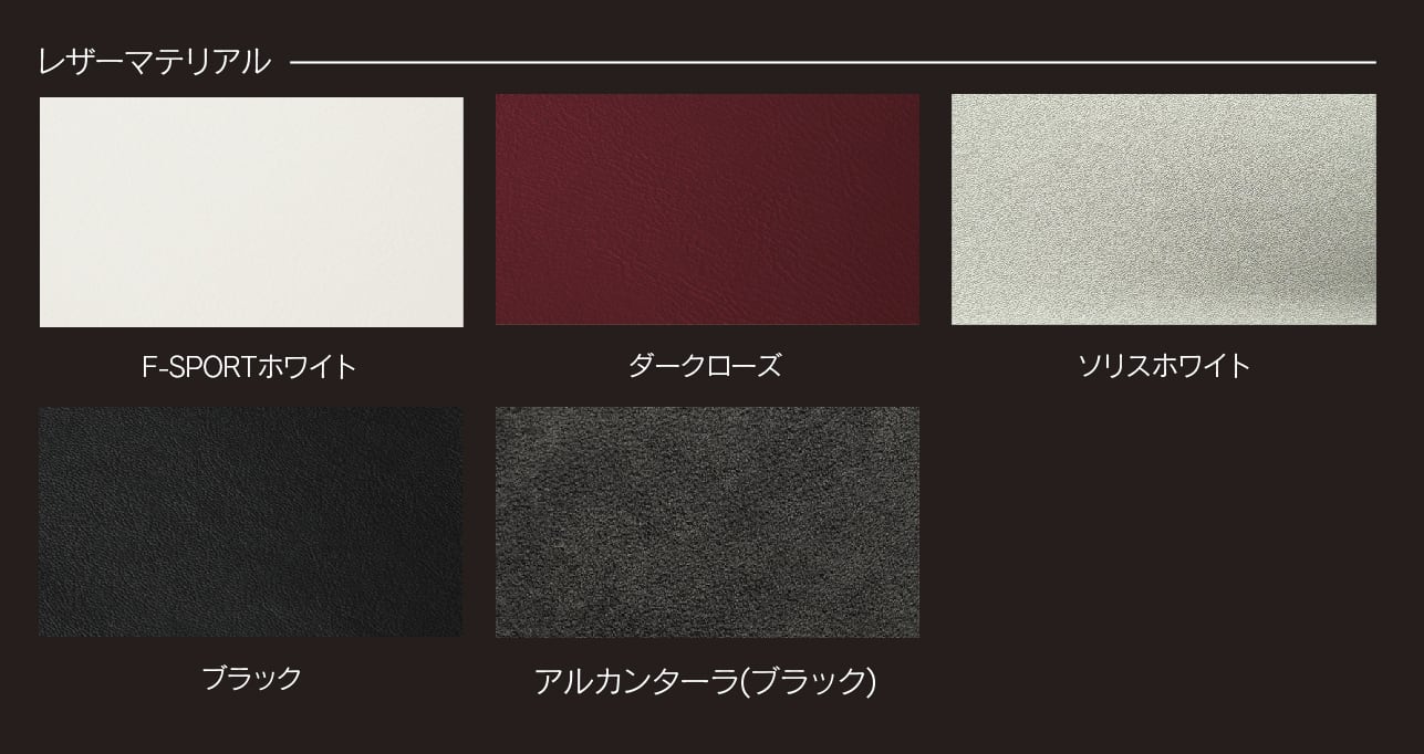 レザーカラーは、Fスポーツホワイト、ソリスホワイト、ダークローズ、ブラックよりお選び下さい。