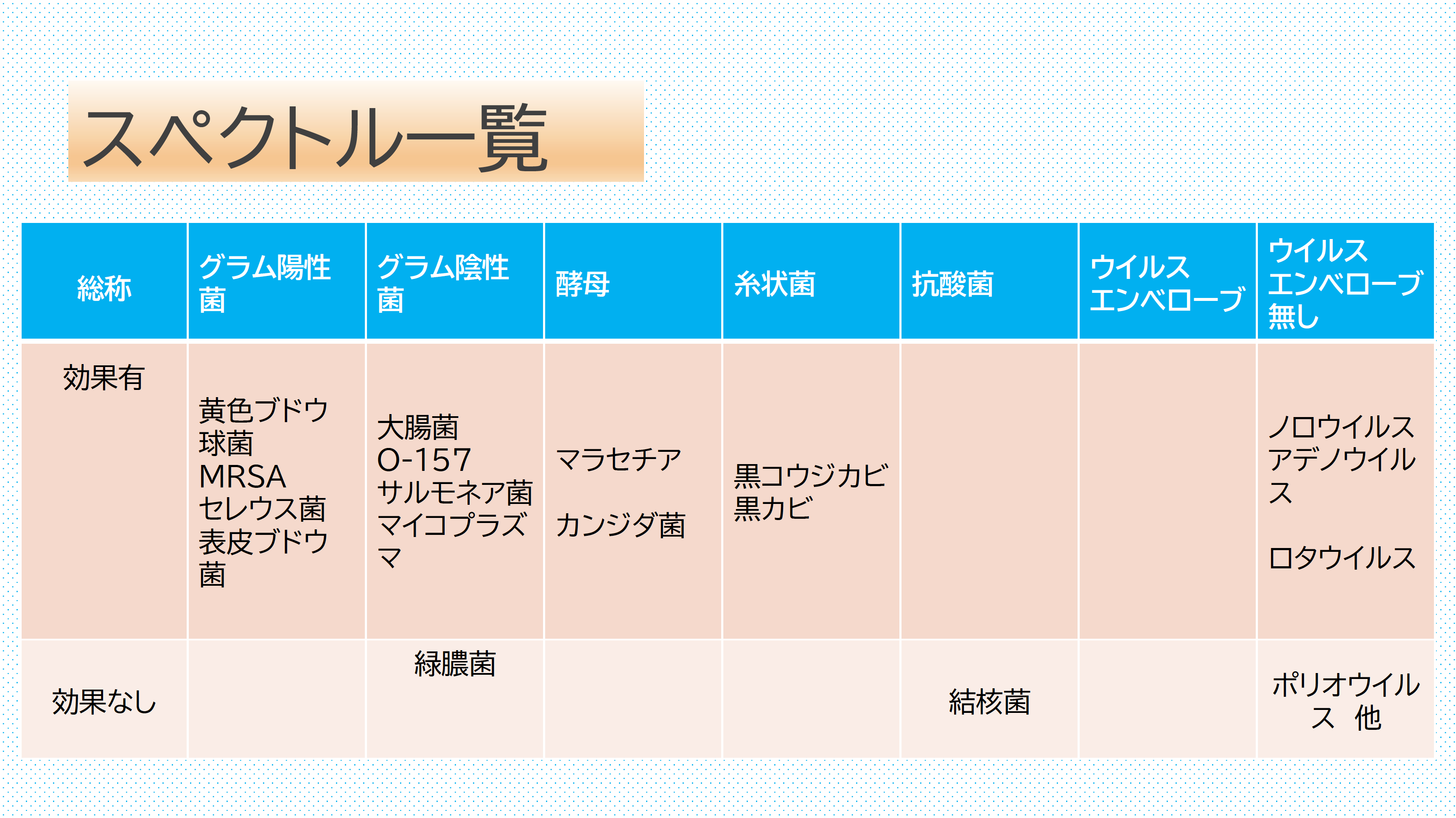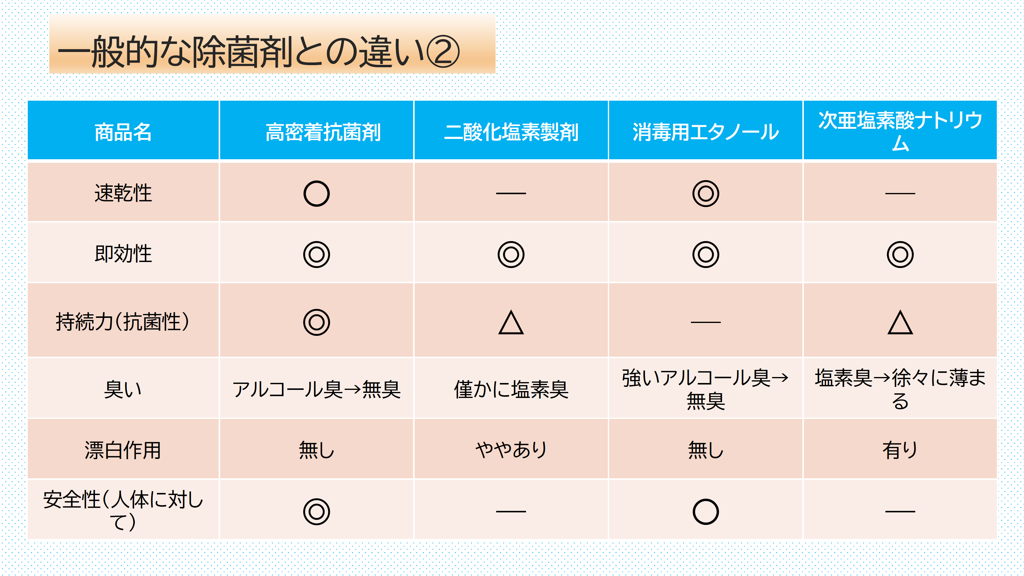 ②乾燥後は無臭で漂白作用もありません。抗菌性能が高く、噴霧後は素材への定着反応が早いため、従来品と比べ、持続性が長く抗菌効果が高い除菌剤となります。