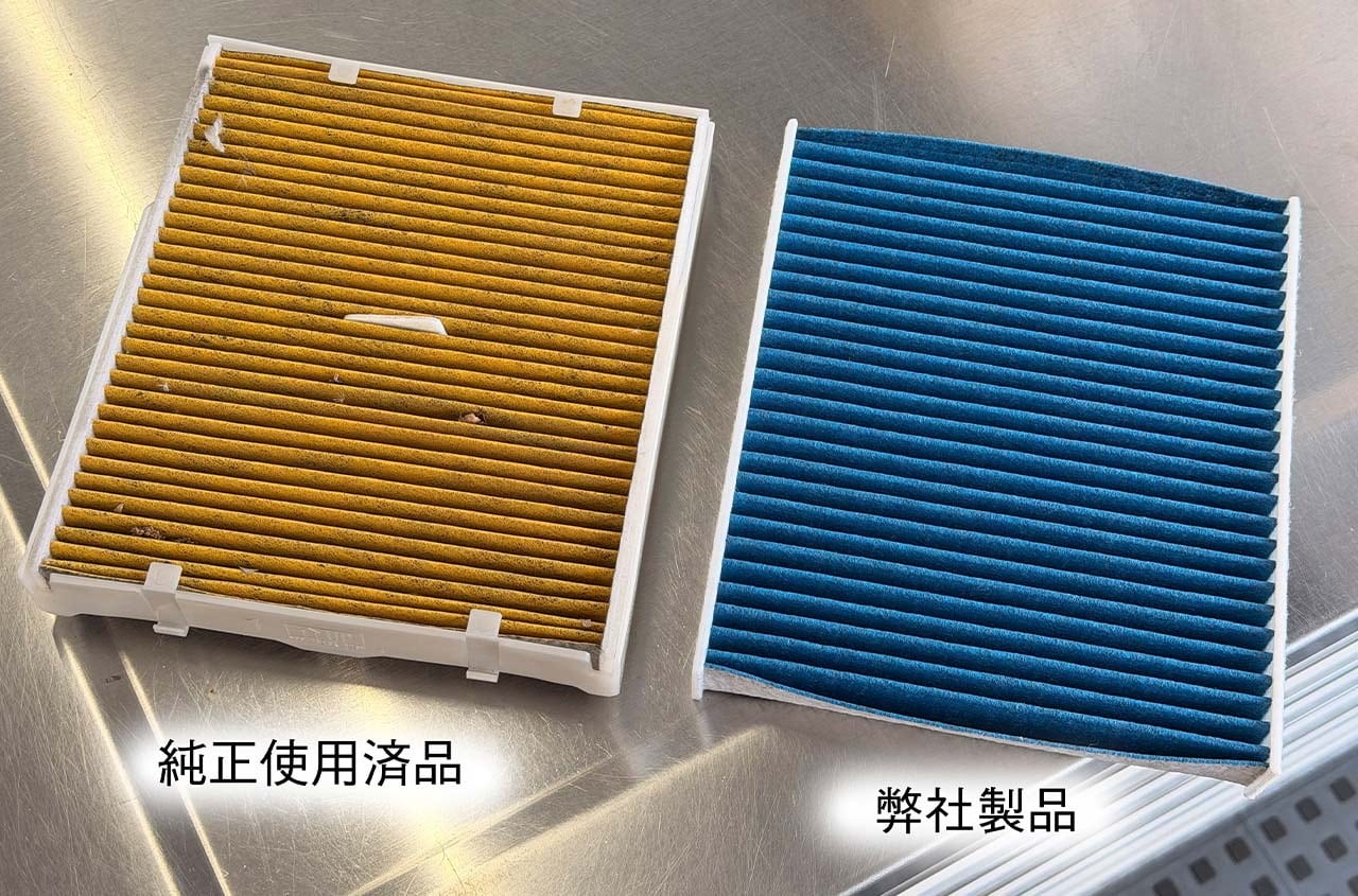 高密度静電気帯電不織布を採用したフィルターでPM2.5などの発がん性物質、スギやヒノキなどのアレル物質、黄砂やカビ胞子までしっかりブロックします。 さらに、抗菌・防カビ効果を高めた特殊なナノAg(銀)殺菌不織布の採用によりフィルターでキャッチした菌やカビの繁殖を抑制します。上質な不織布濾材をフィルターエレメントに使用し、溶剤を含む接着剤を使用せず熱処理により各層を融着させています。それによりエアコン風量への影響を最小限に抑えブロアーモーターの負担を減らすことができます。